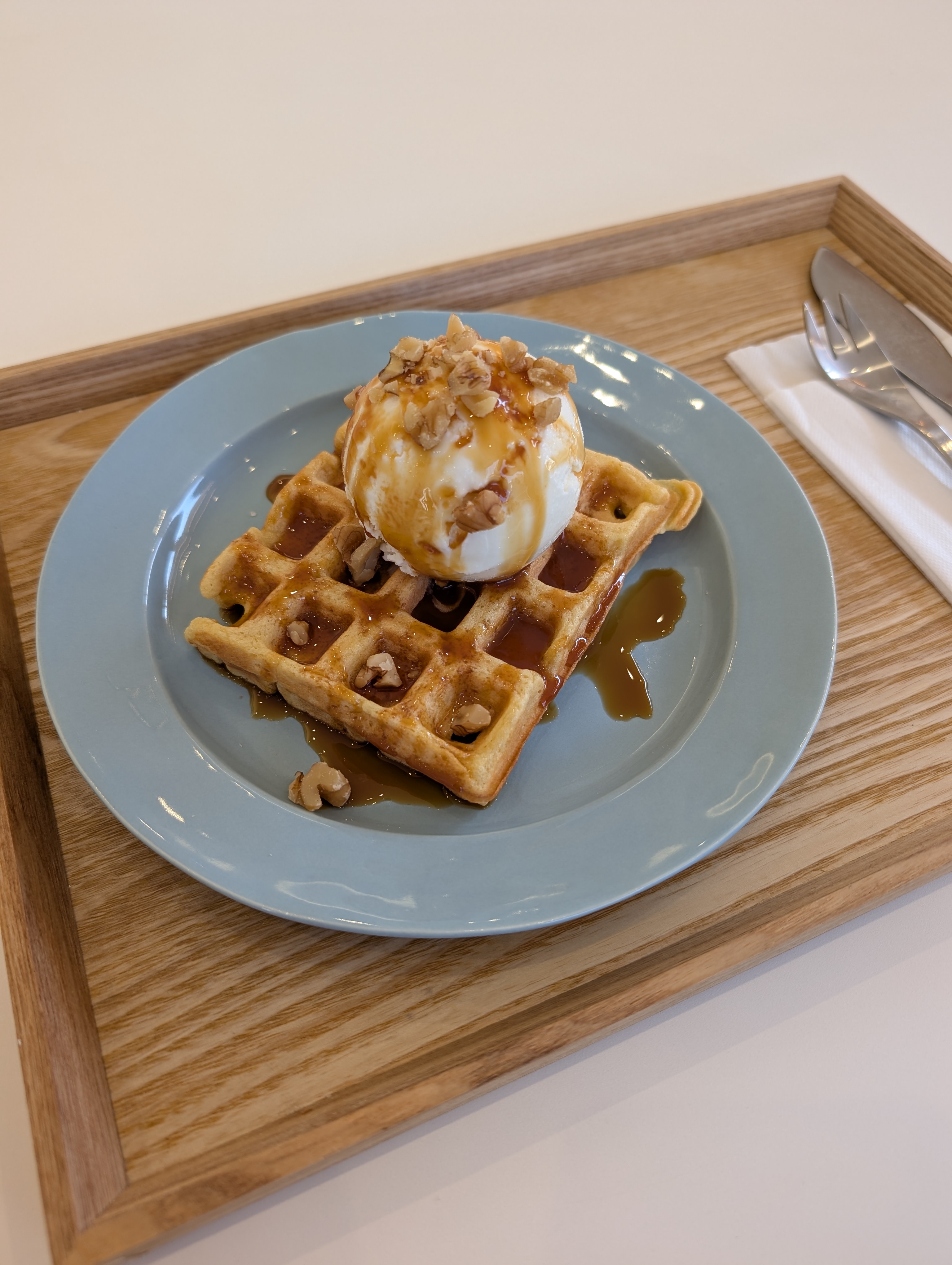 うみ近くのカフェ、うみとやまとで選べるジェラートをのせたあったかワッフルを食べながらご褒美ワークショップはいかがですか?
